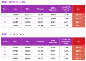 The average member of staff will be £2,780 worse off as a result TSB/Accord Recognition Award and the agreement to scrap the TSB Award for 2019. The tables below set out the average loss by grade, based on mid-point salaries.