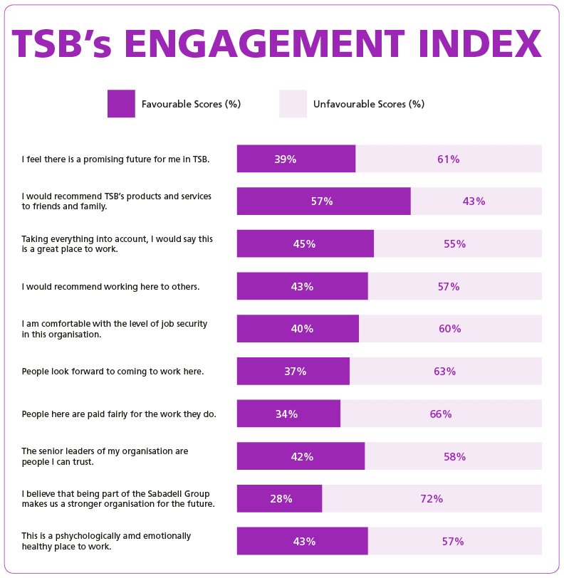 The recent results from the Partner Engagement Survey are truly shocking. Only 60% of staff trust TSB compared to the external benchmark figure of 77%. The TSB employee engagement score – which is based around 9 questions including ones on positive outcomes for the organisation and its employees, importance of work, advocacy of the organisation and willingness to go the extra mile – is 55%. External organisations that take part in the survey have an engagement score of 80%. But the TSB results don’t tell the true story because 30% of staff, an unprecedented figure, couldn’t be bothered to fill in the survey in the first place.