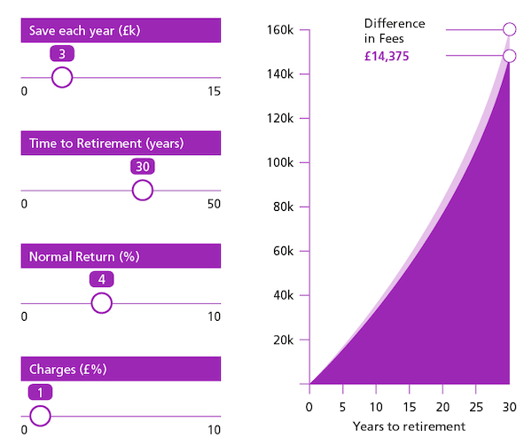 If you invest £3,000 a year (employer and employee contributions) for your retirement 30 years away, and the investment fund costs 1% of the money invested and the fund manager achieves an average return of 4% a year before fees, your savings pot will grow to £147, 584.