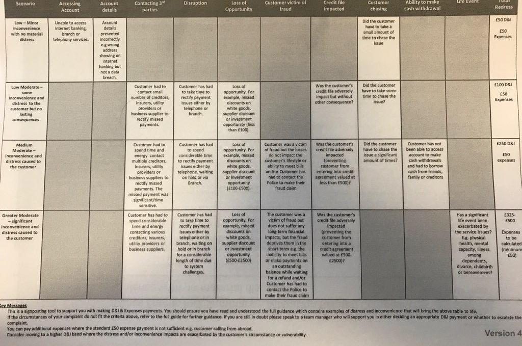 The TSB customer complaints matrix, a copy of which is set out below, is open to such a wide degree of individual interpretation that two customers suffering the same degree of distress and inconvenience could get significantly different payments. So, for example, customers chasing the bank about their accounts were entitled to a payment of between £50 and £250, depending on how often they contacted TSB. What’s the difference between a customer who contacted TSB twice and spent an hour on the phone and another customer who contacted the bank 10 times but also spent an hour on the phone. Arguably, there is no difference but one gets £50 and another get £250. In fact, tens of thousands of TSB customers could argue that they should have received larger payments once they see the matrix. In its rush to scapegoat individual members of staff, TSB has potentially opened Pandora’s box. We received a copy of this matrix a few months ago and decided against highlighting its inconsistencies – to the FCA and Treasury Select Committee who are investigating the TSB meltdown – for fear of causing further damage to the bank from customers complaining that they had been short changed. The bank’s decision to persecute our members means that we have no such compunction now. Equally, TSB needs to understand that we have set up a team of lawyers to review every case and we will protect our members against this witch hunt, no matter what it takes.